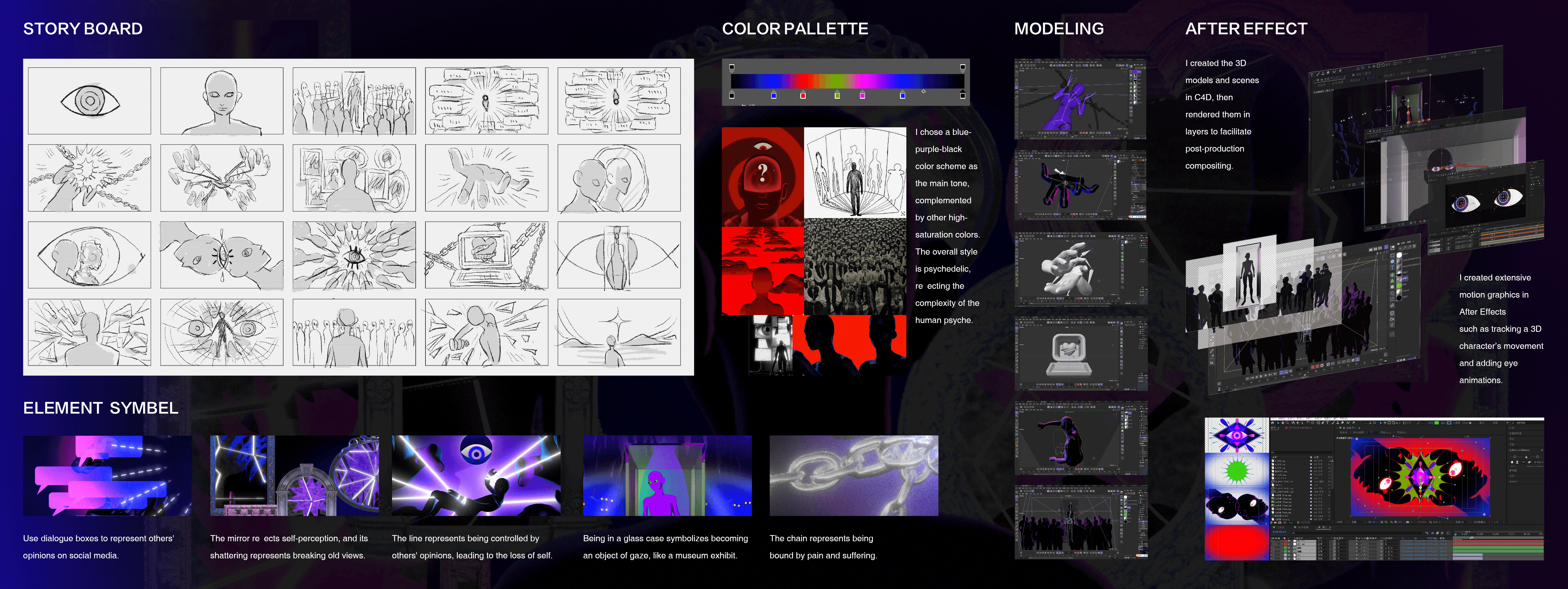 This project blends 3D and 2D techniques to explore self-objectification and inner struggle under the gaze of others. It follows the protagonist’s journey to overcome external judgment, break free from identity crisis, and achieve self-liberation. Using symbolic elements like light and transformation, the film reflects on the relationship between self and others, exploring the quest for inner freedom.